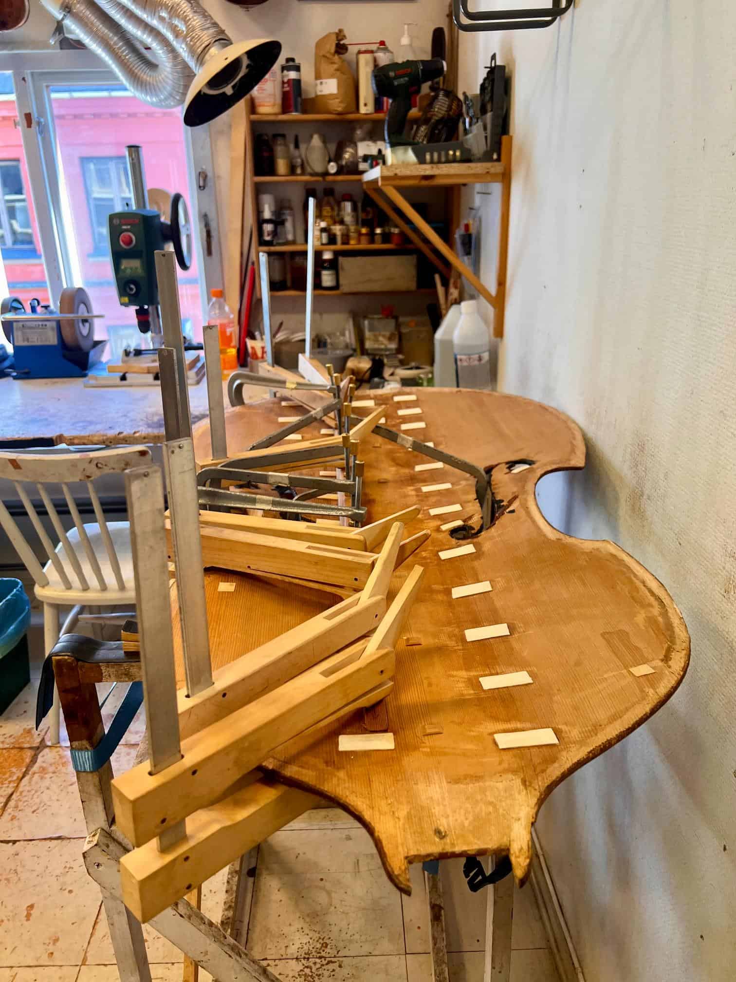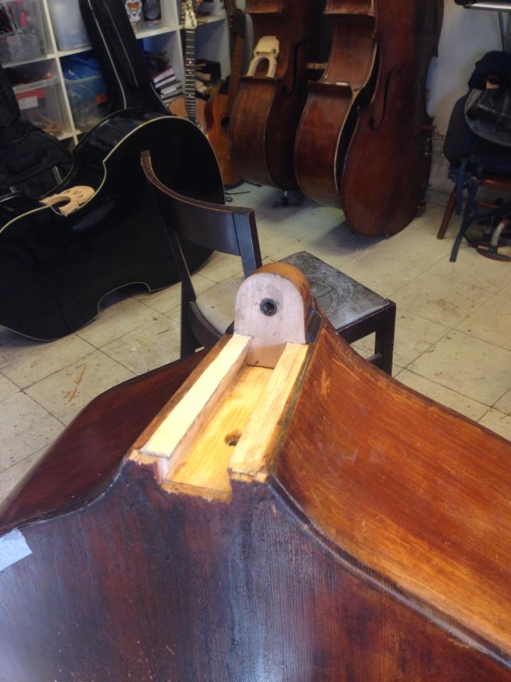Her har jeg reparert en stor skade i sargen på kontrabass/cello, og gjenopprettet både strukturen og lydkvaliteten, slik at instrumentet fungerer optimalt igjen.